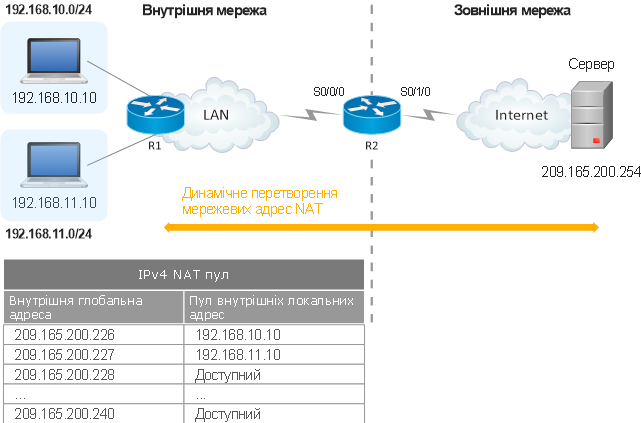 У довідковій топології, показаній на малюнку 1, внутрішня мережа використовує адреси з простору приватних адрес, визначеного в RFC 1918. До маршрутизатора R1 підключені дві локальні мережі — 192.168.10.0/24 і 192.168.11.0/24. Граничний маршрутизатор R2 налаштований на динамічне перетворення NAT з використанням пулу публічних IPv4-адрес від 209.165.200.226 до 209.165.200.240.