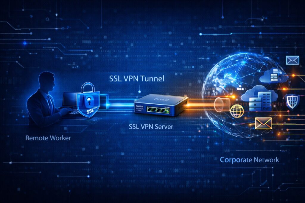 Cisco IOS SSL технологія VPN забезпечує зв’язок віддаленого доступу від майже будь-якого вузлу, що має підключення до мережі Інтернет за допомогою веб-браузеру і його власного шифрування SSL.